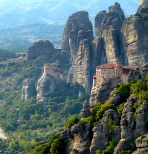 Ensemble de monuments religieux situé dans une formation géologique du nord de la Grèce, en Thessalie, dans la vallée du Pénée. Ces monuments sont perchés au sommet de falaises et pitons rocheux gris, sculptés par l'érosion.
