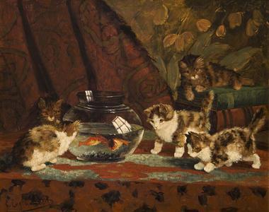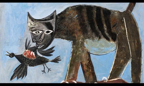 Tableau d'un peintre surréaliste allemand, adepte d'une utilisation minimaliste de la ligne, de la forme, de la couleur : un oiseau semble voler, non pas sur, mais dans la tête d'un chat. L'œuvre suggère la pensée du chat, son instinct de chasse.