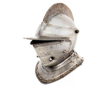 19 décembre 1562. Casque de guerre porté par le connétable de France, chef de l'armée catholique, à la bataille de Dreux, livrée contre les huguenots du prince de Condé. On distingue le trou par où pénétra la balle d'arquebuse qui lui brisa la mâchoire.