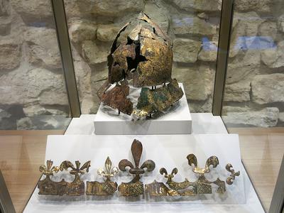 1380-1422. Casque de parade retrouvé, éclaté en plus de 150 morceaux, dans les fossés de la forteresse du Louvre. Il fut porté par un roi surnommé "le Bien-Aimé", puis "le Fou" après une crise de démence lors d'une partie de chasse en forêt du Mans.