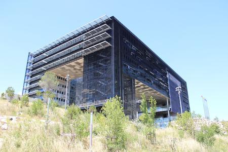 La nouvelle mairie d'une ville du Midi de la France a la forme d'un rectangle (50m x 40m), recouvert d'aluminium bleu. Le mélange de béton, d'acier et de verre donne à cette réalisation des accents futuristes.