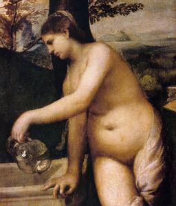 Quel sens peut bien avoir le geste de cette femme nue qui, se détournant d'une flûtiste nue, d'un luthiste et de son voisin habillés, vide une cruche dans une vasque ou fontaine beaucoup trop grande pour qu'elle puisse la remplir ? Mystère !