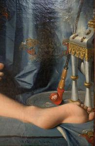 Un brûle-parfum dégage de forts jets de vapeur formant des volutes gris et souples dans l'atmosphère d'un hammam arabe ou turc, où le peintre a saisi la beauté d'une femme du harem, nue, sans autre ornement que le turban qui ceint son front.