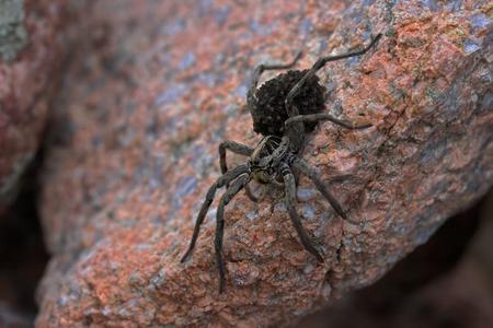Cette "araignée-loup", du genre Hogna, appartient à la famille des Lycosidés. Elle présente un corps brunâtre. Comme pour la plupart des araignées, la femelle est plus grande que le mâle.