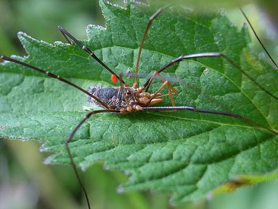 Cet arachnide, de l'ordre des Opilions, appartient au genre Phalangium. Il présente des chélicères en forme de cornes. Il possède des pattes longues et fines.
