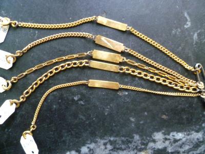 Bracelet formé d'une chaîne en métal à mailles aplaties et d'une plaque rigide et lisse, sur laquelle est souvent gravé un prénom sur l'endroit, et une date de naissance sur l'envers.