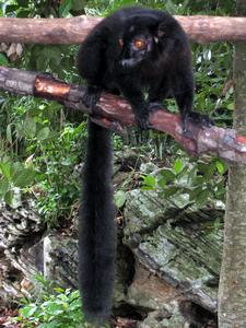 Ce primate, du genre Eulemur, présente un important dimorphisme sexuel. Le mâle présente une fourrure entièrement noire tandis que la femelle présente une fourrure roussâtre.