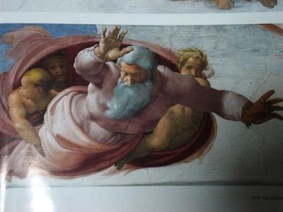 Dieu, abritant la cohorte des anges sous son manteau céleste, tend le doigt pour transmettre à sa belle créature le souffle de l'Esprit : par les bras et les mains, l'étincelle créatrice passe de l'un à l'autre, et le premier homme se soulève de terre.