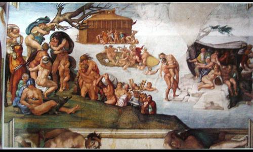 Illustration de l'inondation gigantesque décidée par le Créateur afin de détruire tout être vivant, à cause de la méchanceté humaine, à l'exception d'un seul homme choisi pour être sauvé en vue du repeuplement de la Terre.