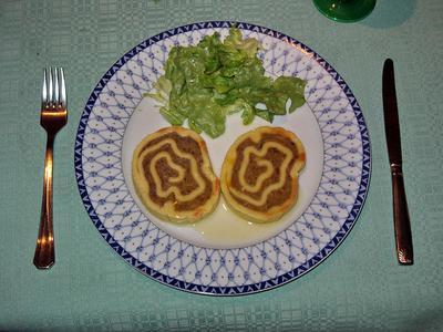 Farce composée de viande cuite (reste de pot-au-feu), œufs frais, oignon, persil, sel, poivre, roulée dans de la pâte à nouilles, puis le tube est découpé en tranches dorées à la poêle puis pochées dans le bouillon du pot-au-feu.