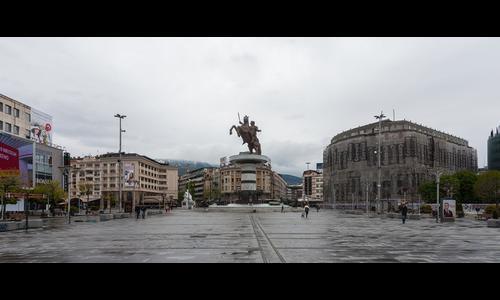 Dans une ville des Balkans, c'est la place la plus vaste du pays, reliée au vieux bazar ottoman par un pont de pierre enjambant le Vardar. En son centre, une statue équestre évoque Alexandre le Grand, le plus célèbre enfant du pays de tous les temps.