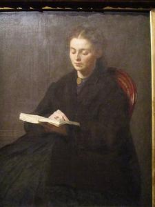 Tableau dépouillé et sévère d'un peintre réaliste et intimiste, qui représente une de ses sœurs en robe noire, absorbée dans la lecture. L'immobilité du modèle, les tonalités sourdes, créent une atmosphère de calme, de silence, de recueillement.