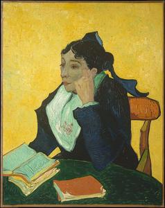 Rêveuse devant son livre ouvert, Madame Ginoux, visage méditatif, est la tenancière du Café de la Gare, à Arles, qui logea le peintre pendant son séjour dans cette ville et s'occupa de lui quand il fut hospitalisé.