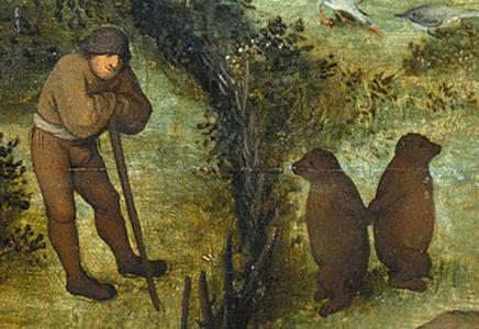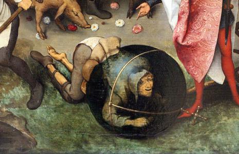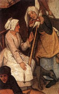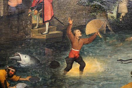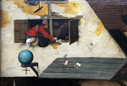Tableau rassemblant quantité de petites saynètes qui illustrent des proverbes, dictons ou expressions populaires. L'ensemble constitue une sorte d'encyclopédie des comportements déraisonnables des hommes, et une vaste leçon de morale.