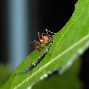 Cette fourmi sud-américaine découpe des feuilles qu'elle transporte jusqu'à sa fourmilière. Ces feuilles servent à cultiver les champignons dont elle se nourrit.