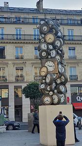 Œuvre répondant à une commande de l'Etat sur le thème du voyage pour orner le parvis d'une gare : en forme de colonne de presque 5 mètres de hauteur, elle est constituée d'une accumulation de pendules marquant des heures différentes.