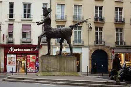 Statue monumentale, représentant une créature mythique à corps de cheval et buste d'homme. La tête est un autoportrait du sculpteur. Dans sa cuirasse se trouve une petite statue de la Liberté. Une colombe de la paix repose sur sa main gauche.