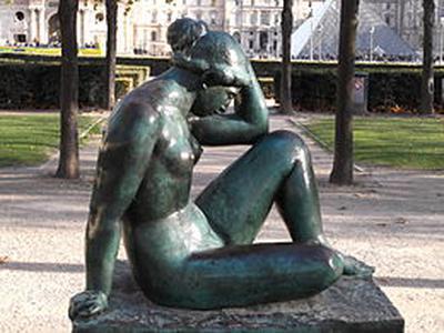 Statue en bronze, œuvre d'un sculpteur qui a fait du nu féminin son motif favori, à la recherche d'un idéal aux courbes impeccables et aux proportions harmonieuses. Elle a été aussi appelée "Jeune fille accroupie", "Femme", "La Nymphe", "La Pensée".