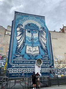 Peinture d'un street-artiste engagé américain qui a choisi Paris pour sa 100e fresque murale. Il y exprime son souhait de voir le monde contemporain évoluer positivement, grâce à l'éducation. "Connaissance + Action = Pouvoir" écrit-il.