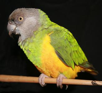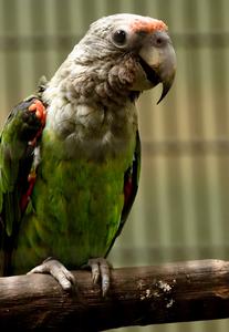 Ce gros perroquet africain, du genre Poicephalus, est également appelé perroquet du Cap. Le haut de sa poitrine et sa tête sont gris tandis que ses ailes et son ventre sont verts.