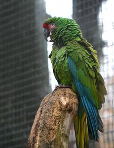 Ce grand perroquet possède un plumage essentiellement vert et bleu clair. Il est reconnaissable à son front rouge. Il appartient au même genre que les espèces "Ararauna" et "Macao".