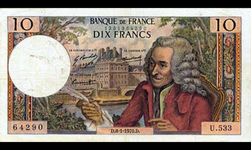 Billet de 10 francs, émis entre 1963 et 1973. Recto : portrait d'un écrivain et philosophe du XVIIIe, plume à la main, avec en arrière-plan, le pavillon de Flore du Palais du Louvre. Verso : le même portrait, devant le château de Cirey où il a séjourné.