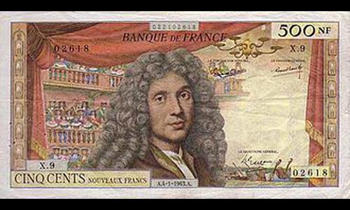 Billet émis de 1959 à 1966. Recto : un dramaturge et comédien du XVIIe siècle, devant les loges remplies de spectateurs d'un théâtre et la fosse d'un orchestre. Verso : le même portrait devant un plateau de théâtre où se joue "Le Malade imaginaire".
