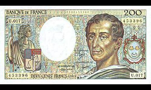 Billet de 200 francs, émis de 1981 à 1994. Recto : le portrait d'un philosophe des Lumières, avec ses armoiries et une allégorie de "De l'Esprit des lois". Verso : le même portrait, et le château de La Brède où il naquit.
