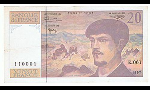 Dernier billet de 20 francs, émis à partir de 1981. Recto : buste d'un compositeur devant une mer houleuse en référence à La Mer, une de ses œuvres orchestrales, et au verso, le même portrait, devant un décor de l'opéra Pelléas et Mélisande.