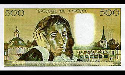 Billet de 500 francs, émis de 1968 à 1994. Recto : un grand homme du XVIIe, reposant la tête sur une main et en fond, la tour saint Jacques et la cathédrale de Clermont-Ferrand. Verso : le même portrait, avec la chapelle de l'Abbaye de Port-Royal.