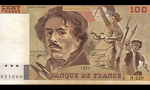Billet de 100 francs, émis de de 1978 à 1995. Recto : un autoportrait d'un peintre du XIXe siècle, et une partie de son plus célèbre tableau, "La Liberté guidant le peuple". Verso : le même autoportrait, une plume d'oie à la main.