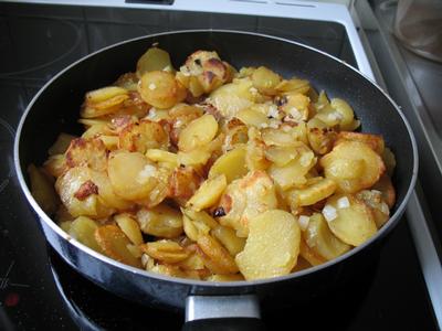 Pommes de terre coupées en rondelles, cuites à l'aide d'une matière grasse dans une poêle ou une sauteuse, à feu plus ou moins vif, jusqu'à ce que l'aliment prenne de la couleur, et peuvent être accompagnées d'oignons, champignons, lardons.