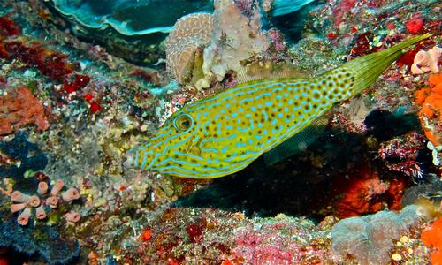 Ce poisson, du genre Aluterus, est également appelé bourse écriture. Il présente une peau variant du jaunâtre au brun parsemée de taches plus claires. Il possède des écailles rugueuses.