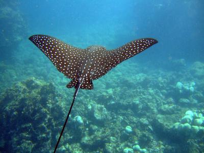Ce poisson cartilagineux, du genre Aetobatus, présente une robe grise tachetée de blanc. Il possède, sur la pointe de sa queue, des dards venimeux dont la piqûre peut être mortelle pour l'homme.