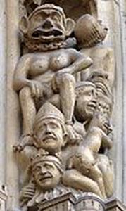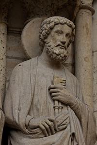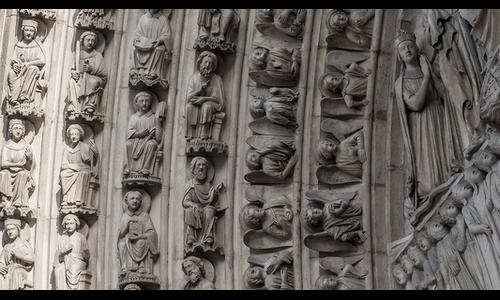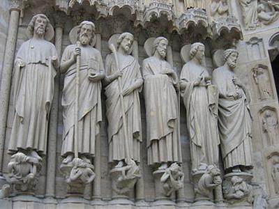 Grandes statues occupant l'ébrasement de gauche du portail.