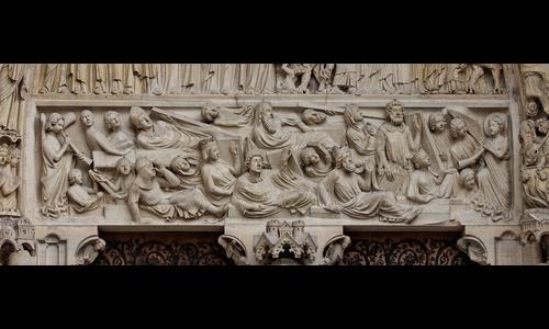 Abraham recueille trois âmes pieuses dans son giron. Au Moyen-âge, le sein d'Abraham, considéré comme le lieu d'attente des justes, était représenté sous la forme d'un panier contenant trois petits enfants.
