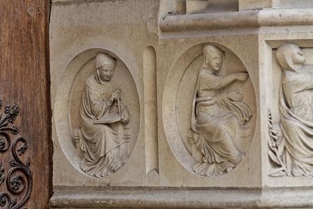 Portail à deux vantaux séparés par un trumeau, et encadrés de deux piédroits. Deux linteaux superposés portent le tympan. Archivolte à six voussures. Douze grandes statues occupant les ébrasements du porche. Panneaux sculptés au-dessous.