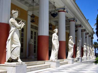 Palais de marbre blanc, de style néo-classique, sorte de temple grec, avec son péristyle des Muses et sa galerie des philosophes, construit sur une île ionienne par l'épouse de François-Joseph d'Autriche, qui y trouve un refuge pour son âme tourmentée.