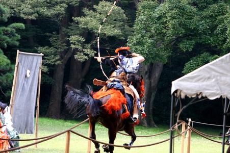 Un cavalier lancé au galop doit tirer successivement des flèches sur trois cibles. Technique d'entraînement à l'arc des samouraïs depuis le IXe siècle, de nos jours elle est pratiquée souvent lors d'événements officiels ou de cérémonies religieuses.